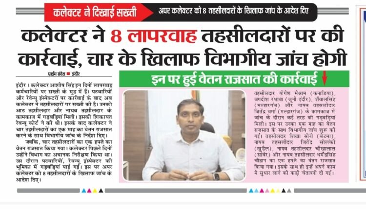 इंदौर । कलेक्टर आशीष सिंह इन दिनों लापरवाह कर्मचारियों पर सख्ती के मूड में हैं। पटवारियों और रेवेन्यू इंस्पेक्टरों पर कार्रवाई के बाद अब कलेक्टर ने तहसीलदारों पर सख्ती की है। उनको आठ तहसीलदार और नायब तहसीलदार के कामकाज में गड़बड़ियां मिली। इसकी शिकायत रेवन्यू कोर्ट ने की थी। इसके बाद कलेक्टर ने चार तहसीलदारों का एक माह का वेतन राजसात करने के साथ विभागीय जांच के निर्देश दिए। जबकि, चार तहसीलदारों का एक हफ्ते का वेतन राजसात किया गया। कलेक्टर पिछले दिनों उन्होंने विभाग का अचानक निरीक्षण किया था। उस दौरान पटवारियों, रेवन्यू इंस्पेक्टर की भूमिका में गड़बड़ियां पाई गई। इस पर अपर कलेक्टर को 8 तहसीलदारों के खिलाफ जांच के आदेश दिए।