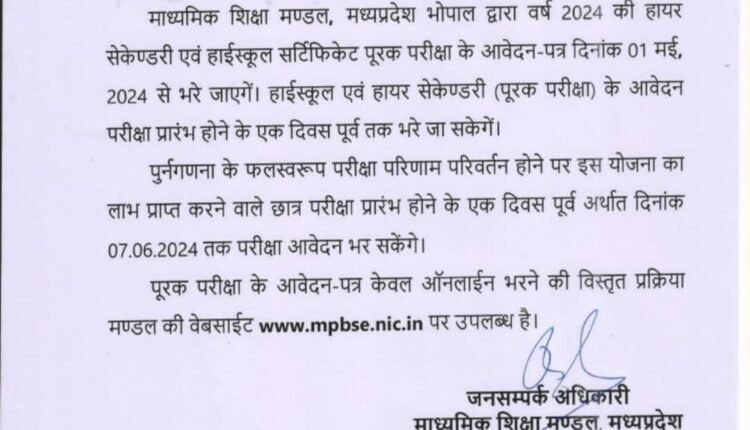 भोपाल । माध्यमिक शिक्षा मण्डल, मध्यप्रदेश भोपाल द्वारा वर्ष 2024 की हायर सेकेण्डरी एवं हाईस्कूल सर्टिफिकेट पूरक परीक्षा के आवेदन-पत्र दिनांक 01 मई, 2024 से भरे जाएगें। हाई