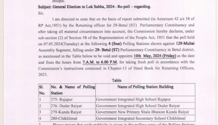 बैतूल संसदीय क्षेत्र की मुलताई विधानसभा के 4 मतदान केन्द्रों में पुनर्मतदान के आदेश