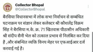 बूथ के पीठसीन अधिकारी संदीप सैनी, सहायक सीआर बाथम, मनोज कुमार मौर्य और मदन गोपाल पटेल को किया सस्पेंड।