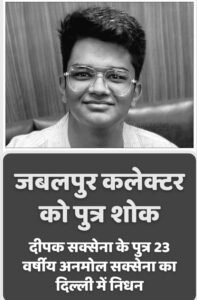 Breaking *लू से कलेक्टर पुत्र का निधन जबलपुर कलेक्टर दीपक सक्सेना के बेटे अनमोल का 20 साल की उम्र में निधन*