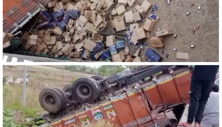 देशी शराब के कार्टूनों से भरा ट्रक सेंडोरा पुलिस चौकी के समीप पुलिया से जा टकराया ट्रक में लाखों रुपए कीमत की भरी थी शराब को हुआ भारी नुकसान