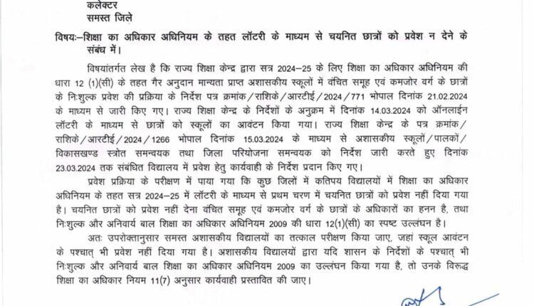 RTE me चयनित छात्रों को स्कूल में प्रवेश नहीं देने के सम्बन्ध में आदेश जारी