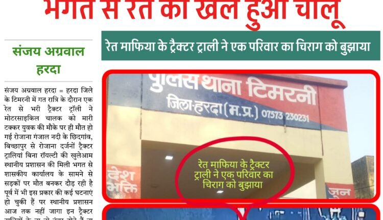 संजय अग्रवाल हरदा = हरदा जिले के टिमरनी में गत रात्रि के दौरान एक रेत से भरी ट्रैक्टर ट्रॉली ने मोटरसाइकिल चालक को मारी टक्कर युवक की मौके पर ही मौत हो गई रोजाना गंजाल नदी के छिदगांव, बिच्छापुर से रोजाना दर्जनों ट्रैक्टर ट्रालियां बिना रॉयल्टी की खुलेआम स्थानीय प्रशासन की मिली भगत से शासकीय कार्यालय के सामने से सड़कों पर मौत बनकर दौड़ रही है पूर्व में भी इस प्रकार की कई घटनाएं हो चुकी हैं पर स्थानीय प्रशासन आज तक नहीं जागा इन ट्रैक्टर ट्रालियों के ना तो नंबर होते हैं ना ट्राली का रजिस्ट्रेशन बीमा और यहां तक की ड्राइवर का ड्राइविंग लाइसेंस भी नहीं होता है बिना कमर्शियल के ही चल रही है ट्रैक्टर ट्राली रात्रि के दौरान सोडलपुर के करीबि ग्राम सोहागपुर के रहने वाले प्रदीप लक्ष्मी नारायण गुर्जर उम्र 28 वर्ष को गत रात्रि 11:00 बजे के आसपास सोहागपुर से टिमरनी जा रहा था इस दौरान सोडलपुर मार्ग पर गंगा फिलिंग सेंटर के सामने बिना रॉयल्टी के रेत से भरी ट्रैक्टर ट्राली ने टक्कर मार दी जिसकी युवक की मौके पर ही मौत हो गई है शुक्रवार सुबह पीएम कर सब परिवारजनों को दिया मुख्यमंत्री मोहन यादव मंच से अपने अधिकारी कर्मचारियों को कितनी ही हिदायत दे दे पर मुख्यमंत्री का उन पर कोई असर नहीं होता है?