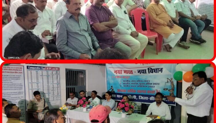 विदित हो कि हाल ही में भारत सरकार द्वारा लाए गए तीन नवीन कानून एवं कुछ आपराधिक धाराओं में किए गए परिवर्तन को 1 जुलाई 2024 से लागू किए जाने के तारतम्य में जिले भर में नवीन कानून का भव्य शुभारंभ 1 जुलाई 2024 किया गया। जिसको लेकर वरिष्ठ पुलिस अधिकारियों के निर्देशन में पुलिस अधीक्षक सीधी द्वारा जिले में एक दिन पूर्व कार्यशाला आयोजित कर जिले के समस्त थाना एवं चौकी प्रभारी को निर्देशित किया गया था कि अपने-अपने क्षेत्र में नए कानून की जानकारी के लिए जागरूकता अभियान चलाकर लोगों को जागरूक किया जाए तथा 1 जुलाई को नवीन कानून का भव्य शुभारंभ नया भारत नया विधान के तर्ज पर किया जाए जिसके परिपालन में थाना प्रभारी मझौली द्वारा यह कार्यक्रम संपन्न कराया गया।
