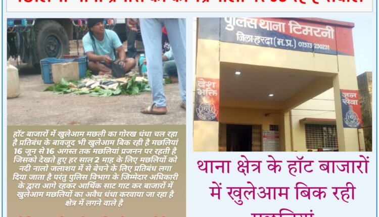 म बिक रही है मछलियां 16 जून से 16 अगस्त तक मछलियां प्रजनन पर रहती है जिसको देखते हुए हर साल 2 माह के लिए मछलियों को नदी नालो जलाशय में से बेचने के लिए प्रतिबंध लगा दिया जाता है परंतु पुलिस विभाग के जिम्मेदार अधिकारी के द्वारा आगे रहकर आर्थिक साट गाट कर बाजारों में खुलेआम मछलियों का अवैध धंधा करवाया जा रहा है क्षेत्र में लगने वाले है बाजारों में खुलेआम मछलियां बेची जा रही है इन स्थानों पर बेची जा रही है मछलियां पोखरनी, बजानिया, छिदगांव, करताना, टिमरनी इन स्थानों पर लंबे समय से मछलियों का व्यापार चल रहा है। जिम्मेदार अधिकारियों के द्वारा खुलेआम इनको छूट दी गई है नहीं करते कार्यवाही।