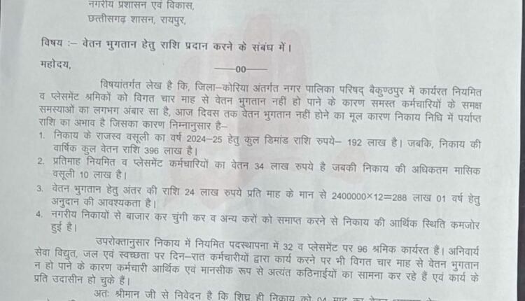 4 माह से नही मिला वेतन उपमुख्यमंत्री व कलेक्टर कोरीया को पत्र लिखकर किया है मांग
