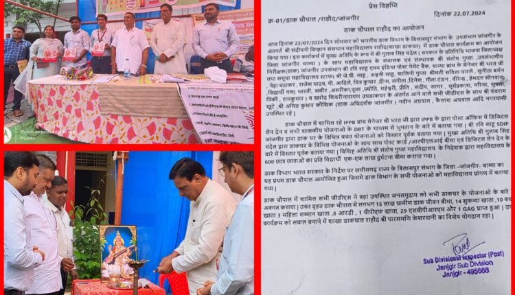 जांजगीर चांपा जिले के पामगढ़ विधानसभा क्षेत्र के राहौद में डाक विभाग के निर्देश पर प्रदेश के बिलासपुर संभाग का प्रथम डाक चौपाल का आयोजन संदीपनी विज्ञान संस्थान महाविद्यालय राहौद में कार्यक्रम रखा गया था। जिसमें मुख्य रूप से भाजपा जिला अध्यक्ष गुलाब सिंह चंदेल उपस्थित थे, विशिष्ट अतिथि के रूप में महाविद्यालय संचालक एवं संस्थापक संतोष गुप्ता उप संभागीय निरीक्षक जांजगीर उपसंभाग रवि साहू एवं इंडिया पोस्ट पेमेंट बैंक चांपा ब्रांच के मैनेजर भरत उपस्थित रहे कार्यक्रम के दौरान उपस्थित जन समुदाय को सभी डाकघर के योजनाओं के बारे में अवगत कराया गया। डाक चौपाल में ब्रांच मैनेजर भरत ने आईपीपीबी के द्वारा पोस्ट ऑफिस में डिजिटल लेनदेन व सभी शासकीय योजनाओं के डीबीटी के माध्यम से भुगतान के बारे में बताया वही रवि साहू एचडीआईपी जांजगीर ने डाकघर के विभिन्न बचत योजनाओं की जानकारी दी कार्यक्रम में मुख्य रूप से समुचा महाविद्यालय स्टाफ( श्री जे पी साहू , अश्वनी साहू , शिलिनी गुप्ता, श्रीमती सविता बारले, सुनीता बर्मन नेहा चंद्राकर, राजेश यादव ,पी आदिले, चित्रकुमार, दीना संगीता ,दिनेश, गीता टंडन, वीरेंद्र ,हेमदत,वरिष्ठ नागरिक अवधेश सिंह चन्देल सामाजिक कार्यकर्ता सरोज कुमार सारथी सहित सभी छात्र छात्राएं उपस्थित रहे।