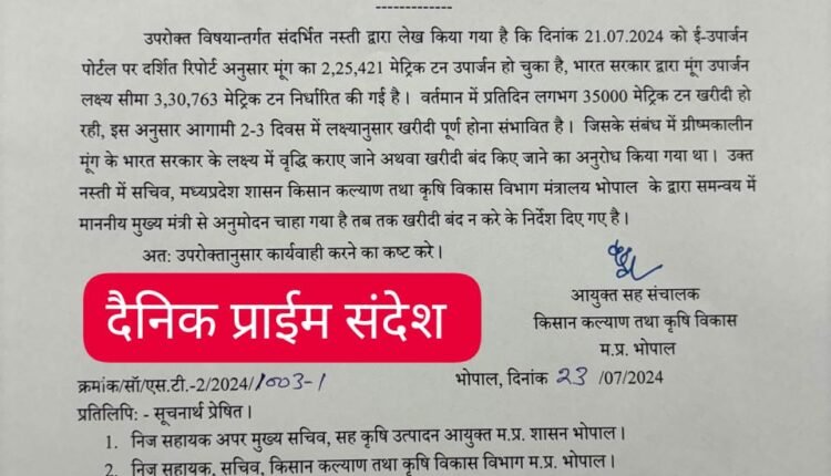 मूंग खरीदी को लेकर जारी हुआ आदेश, किसान कल्याण तथा कृषि विकास विभाग मंत्रालय