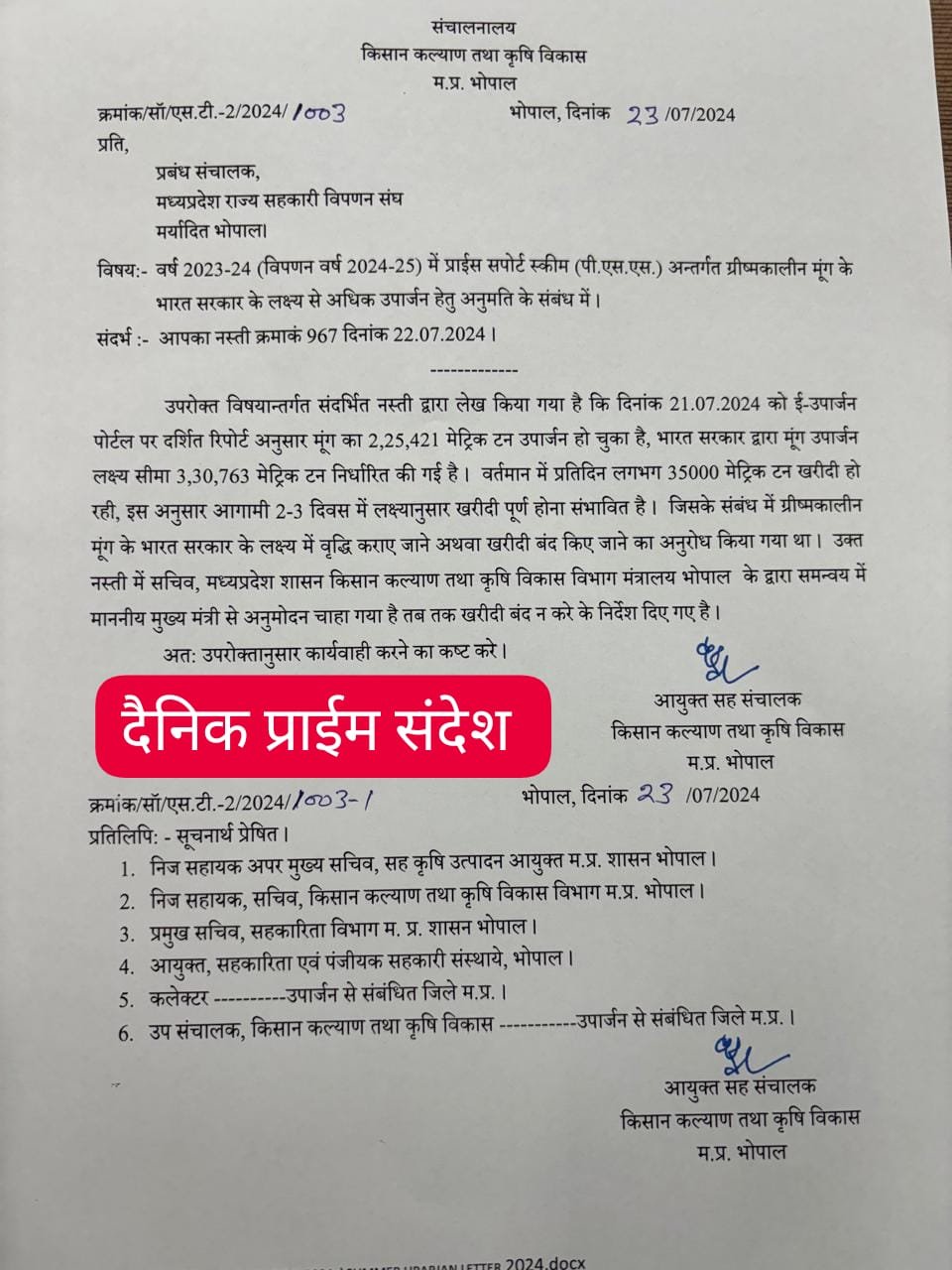 भोपाल । संचालक, मध्यप्रदेश राज्य सहकारी विपणन संघ मर्यादित भोपाल, वर्ष 2023-24 (विपणन वर्ष 2024-25) में प्राईस सपोर्ट स्कीम ( पी.एस.एस.) अन्तर्गत ग्रीष्मकालीन मूंग के भारत सरकार के लक्ष्य से अधिक उपार्जन हेतु अनुमति के संबंध में