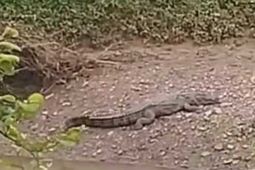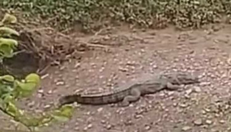 नाले से बाहर निकलकर खेतों में टहलते हुए दिखा छह फीट लंबा मगरमच्छ