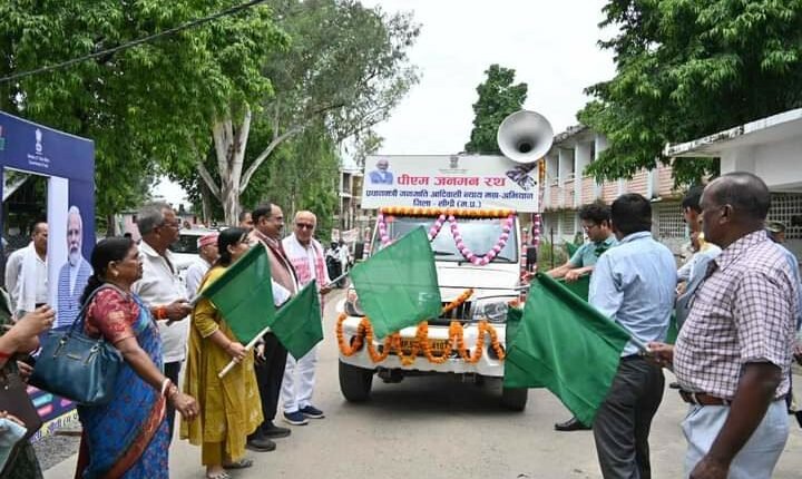 प्रधानमंत्री जनजाति आदिवासी न्याय महाअभियान आई.ई.सी. कैम्पेनिंग के तहत सीधी सांसद डॉ राजेश मिश्रा, आयुक्त निःशक्तजन कल्याण संदीप रजक तथा कलेक्टर स्वरोचिष सोमवंशी द्वारा प्रचार वाहन को हरी झंडी दिखाकर रवाना किया। पी.एम.जनमन रथ 05 पी.व्ही.टी.जी. आदर्श ग्रामों (करवाही, पाॅड, टंसार, कठार एवं बारी कोठार) के साथ पी.व्ही.टी.जी. बैगा बाहुल्य ग्रामों का भ्रमण करेगा।