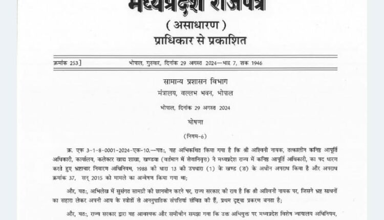 दरअसल साल 2015 में खंडवा में खाद्य विभाग के अधिकारी के ठिकानों पर लोकायुक्त ने दबिश दी थी। लोकायुक्त को कार्रवाई के दौरान करोड़ों रुपए की अघोषित संपत्ति मिली थी। आय से अधिक संपत्ति के मामले में अश्वनी नायक से कोर्ट में जानकारी मांगी जाएगी। आय की जानकारी नहीं देने पर सरकार कोर्ट के आदेश पर उसकी संपत्ति राजसात करेगी। इस आशय का नोटिस सरकार ने राजपत्र में प्रकाशित भी कर दिया है। सरकार के इस कदम से प्रदेश अन्य भ्रष्ट अधिकारियों में हड़कंप की स्थिति है जिसके खिलाफ भ्रष्टाचार के मामले कोर्ट में लंबित है।