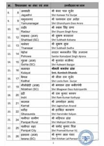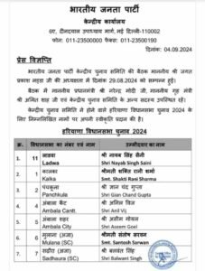 हरियाणा विधानसभा चुनाव के लिए बीजेपी ने अपने उम्मीदवारों की पहली सूची जारी कर दी है। मुख्यमंत्री नायब सिंह सैनी करनाल की बजाय कुरुक्षेत्र की लाडवा सीट से चुनाव लड़ेंगे।