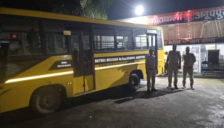 पुलिस अधीक्षक अनूपपुर मोती उर रहमान द्वारा टी. आई. कोतवाली को दिए गए निर्देश के आधार पर वीडियो की तस्दीक करने पर बेथेल मिशन हायर सेकेण्डरी स्कूल अनूपपुर के मालिक श्री पी.के. पुन्नुस निवासी अनूपपुर, प्रिसिंपल डाक्टर सुदीप चक्रवर्ती निवासी अनूपपुर, बस क्रमांक एम.पी. 65 पी 0191 का चालक हेतराम बैगा निवासी सकरा के द्वारा अपराध धारा 281,125 बी.एन.एस., 184 एम.वी. एक्ट का अपराध घटित करना पाये जाने पर प्रकरण पंजीबद्ध कर उक्त बस को जप्त कर बस चालक हेतराम बैगा को गिरफ्तार किया गया है एवं स्कूल के संचालक पी. के. पुन्नुस निवासी अनूपपुर, प्रिसिंपल सुदीप चक्रवर्ती के विरूद्ध भी कार्यवाही की जा रही है।