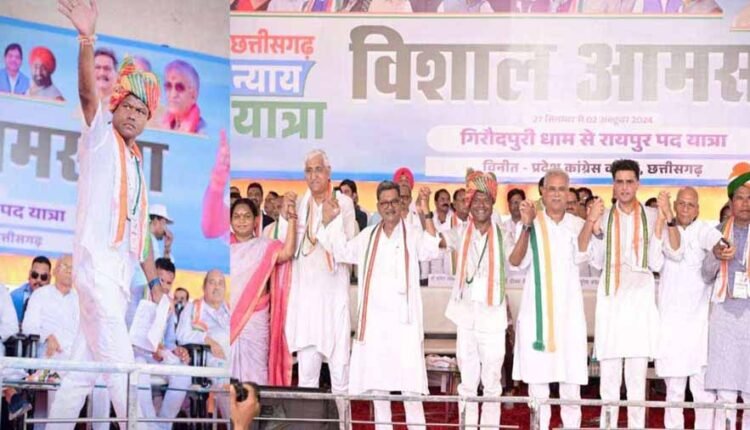 छत्तीसगढ़ में कांग्रेस की न्याय यात्रा का समापन गांधी मैदान में आमसभा के साथ हुआ. आमसभा में सरकार के खिलाफ कांग्रेस के सभी बड़े नेता जमकर गरजे. पायलट, बघेल, महंत, बैज, साहू, चौबे और मरकाम जैसे नेताओं ने सभा को संबोधित करते हुए कहा कि अगर सरकार सचेत नहीं हुई तो प्रदेश भर में संग्राम होगा.