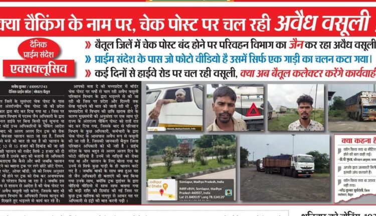 आपको बता दे की मध्यप्रदेश में बॉर्डर चेक पोस्ट पर वर्षो से चल रही अवैध वसूली परिवहन विभाग के द्वारा धड़ल्ले से की जा रही थी जिस पर प्रदेश और दिल्ली तक सेवा पहुंचने की बात की जाती रही थी , पूरे मध्यप्रदेश में विभाग की छवि खराब होने के कारण मुख्यमंत्री की अनुसंशा पर एक साथ पूरे राज्य के अंतराज्य चैकिंग पोस्ट को रातों रात बंद कर दिया गया, जिसके बाद से परिवहन विभाग के कुछ अधिकारी, कर्मचारी के द्वारा चेक पोस्ट के आसपास अवैध रूप से वसूली की जा रही है, जिसकी जानकारी बैतूल जिला परिवहन अधिकारी को भी नही है । प्राईम संदेश के पास बहुत से अलग अलग दिन के फोटो वीडियो है उनमें जो गाड़ियों को रोका गया था और चालान के लिए बोला गया था उनमें से सिर्फ कुछ गाड़ी के ही चालन काटे गए है । जबकि बाकी के साथ क्या हुआ यह तो जैन अधिकारी ही बताएंगे की क्या किया गया उनके साथ, क्योंकि ट्रक ड्राईवर के द्वारा वीडियो वीडियो में साफ साफ बताया गया की बड़ी राशि की डिमांड की गई जिस पर कुछ ट्रक मालिक को नागपुर से आकर यह पर अधिकारी से इंट्री की बात करनी पढ़ी ।