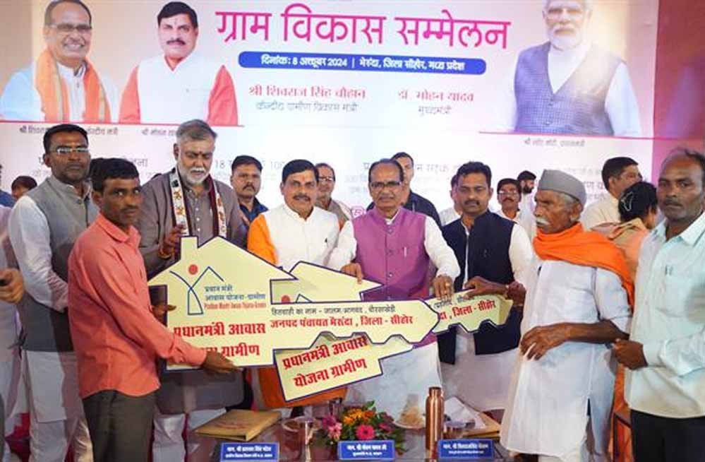 मुख्यमंत्री डॉ. यादव और केंद्रीय ग्रामीण विकास एवं कृषि मंत्री शिवराज सिंह चौहान मंगलवार को सीहोर जिले के भैरूंदा में ग्राम विकास सम्मेलन में शामिल हुए। इस अवसर पर मुख्यमंत्री और केन्द्रीय मंत्री ने पीएमजीएसवाई-IV के अन्तर्गत 500 कि.मी. स्वीकृत सड़कों का शुभारंभ किया तथा स्व-सहायता समूहों के लिए 150 करोड़ रूपए के बैंक ऋण व सामुदायिक निवेश राशि का सिंगल क्लिक से अंतरण किया। साथ ही 8 प्र-संस्करण इकाइयों एवं 100 सामुदायिक प्रशिक्षण केन्द्रों का शुभारंभ भी किया। प्रदेश के 5 नए जिलों में आरसेटी प्रशिक्षण केन्द्र की स्थापना की स्वीकृति भी दी गई। कार्यक्रम में सीहोर जिले के 52818 तेंदूपत्ता संग्रहकों को 2 करोड़ 70 लाख रूपये बोनस राशि का वितरण तथा मध्यप्रदेश सरकार की बाँस मिशन योजना में 215 बाँस हितग्राहियों को 2 लाख 90 हजार बाँस पौधों की अनुदान राशि एक करोड़ 4 लाख 27 हजार रूपये का वितरण भी किया गया।