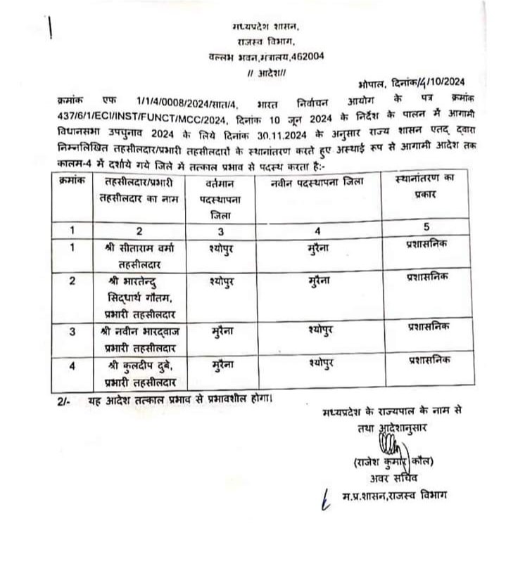 भोपाल/मध्य प्रदेश शासन राजस्व विभाग ट्रांसफर