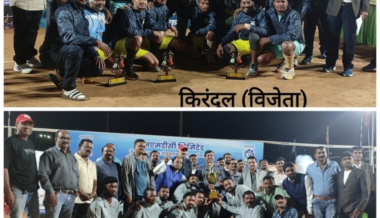 किरंदुल: एनएमडीसी किरंदुल परियोजना द्वारा आयोजित अंतर परियोजना वॉलीबॉल प्रतियोगिता में किरंदुल, बचेली, हैदराबाद, पन्ना, दोनामलाई एवं नगरनार की टीमों ने हिस्सा लिया था। इस प्रतियोगिता का फाईनल मुकाबला किरंदुल एवं बचेली के मध्य खेला गया। जिसमें किरंदुल परियोजना ने लगातार तीन सेट बचेली को हराकर प्रतियोगिता की ट्रॉफी अपने नाम किया। वहीं उपविजेता का गौरव बचेली परियोजना को प्राप्त हुआ। आज के इस फाईनल मुकाबले में एनएमडीसी परियोजना के मुख्य महाप्रबंधक संजीव साही ने दोनों टीम के कप्तान के मध्य में टॉस कराकर खेल को प्रारंभ किया।चिर प्रतिद्वंद्वी माने जाने वाले किरंदुल व बचेली दोनों ही टीमों ने बेहतरीन प्रदर्शन कर दर्शकों का खूब मनोरंजन किया। कड़े मुकाबले में किरंदुल की टीम ने विजय प्राप्त किया। आज के इस फाईनल मुकाबले में किरंदुल परियोजना के उप महाप्रबंधक (कार्मिक) बी के माधव, महाप्रबंधक (विद्युत) सुब्रमण्यम, किरंदुल श्रमिक संघ एसकेएमएस के सचिव राजेश संधू, अध्यक्ष देवरालू, श्रमिक संघ इंटक के सचिव ए के सिंह, बचेली एसकेएमएस के अध्यक्ष जागेश्वर प्रसाद विशेष रूप से उपस्थित थे। तीन दिवस चले इस प्रतियोगिता को सफलतापूर्वक आयोजित करने में किरंदुल परियोजना के स्पोर्ट्स एडवाइजरी कमेंटी का विशेष योगदान रहा। तथा इस प्रतियोगिता में सफलतापूर्वक मंच संचालन राजनाथ सर के द्वारा किया गया।
