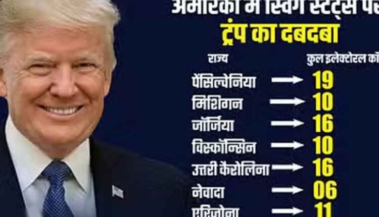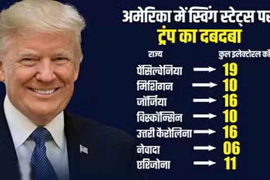 अमेरिका में स्विंग स्टेट उन राज्यों को कहा जाता है, जहां पार्टियों का समर्थन बदलता रहता है। मतलब जहां अमेरिका के कई राज्यों में पहले से विभिन्न सर्वे में पता चल जाता है, कि इन राज्यों में किस पार्टी को जीत मिलेगी, वहीं कुछ राज्यों में बेहद कड़ा मुकाबला होता है और वहां किसी भी पार्टी का पलड़ा भारी हो सकता है। यही वजह है कि इन राज्यों को स्विंग स्टेट कहा जाता है और राष्ट्रपति चुनाव में किस उम्मीदवार को जीत मिलेगा, उसमें इन स्विंग स्टेट की अहम भूमिका होती है। 2024 के चुनाव में सात स्विंग स्टेट थे जिनमें पेंसिल्वेनिया, मिशिगन, जॉर्जिया, विस्कॉन्सिन, उत्तरी कैरोलिना, नेवादा, एरिजोना का नाम शामिल रहा। अब चुनाव नतीजों में सातों स्विंग स्टेट में ट्रंप का जीतना ऐतिहासिक है।