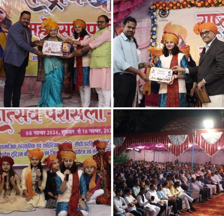 सीधी पुलिस की ब्रांड एम्बेसडर मान्या पाण्डेय के व्दारा नशामुक्ति पर दादू पिआय गांजा तो बड़का पिआय दारु,कपारे मा हाथ धरे रोबय मेहरारू को सुनकर पुलिस अधीक्षक भाव विभोर हो गये। मध्य प्रदेश टूरिज्म बोर्ड भोपाल, जिला पुरातत्व पर्यटन एवं संस्कृति परिषद, मध्य प्रदेश पर्यटन विकास निगम के सहयोग से उत्थान सामाजिक सांस्कृतिक एवं साहित्यिक समिति के व्दारा आयोजित राष्ट्रीय बाणभट्ट महोत्सव के तीसरे दिन की शुरुआत बालकलाकार प्रत्यूष व्दिवेदी सतना के भजन से किया गया। उसके बाद शिवांजन भट्टाचार्य पश्चिम बंगाल के व्दारा बाउल लोक गीत,मानसी तिवारी ने बघेली संस्कार गीत, बलिया उत्तरप्रदेश की लोक गायिका वैष्णवी राय ने भोजपुरी गीत, अर्पणा मिश्रा ने विवाह गीत अंजुरी,कंकण भट्टाचार्य असम ने असामियां, राष्ट्रीय लोक गायिका मान्या पाण्डेय ने आदिवासी लोकगीत टप्पा, कोल दादरा, संजना राज बिहार ने मैथिली लोकगीत, दिव्या व्दिवेदी बघेली लोकगीत दादरा, झारखंड बिहार के सुभाष राय ने देवी गीत, कपिल तिवारी ने विवाह गीत सोहाग, नरेंद्र बहादुर सिंह ने आदिवासी लोकगीत चना के दार की मनमोहक प्रस्तुति दी गई। देश भर से आये लोक कलाकारों के व्दारा सामुहिक रूप से बघेली लोकगीत बिरहा की शानदार प्रस्तुति कर दर्शकों का दिल जीत लिया। इस अवसर पर व्यौहारी विधायक शरद कोल ने कहा कि राष्ट्रीय लोक गायिका मान्या पाण्डेय के कारण इस जंगल में मंगल हो रहा है और देश भर के कलाकार यहां आ कर अपने अपने प्रदेश के लोकगीत सुना रहे हैं। इस तरह का आयोजन सिर्फ हमारी बिटिया मान्या पाण्डेय के व्दारा ही किया जा सकता है। मैं जल्द ही मान्या का कार्यक्रम व्यौहारी में कराउंगा। इस दौरान जिला पंचायत सदस्य व सभापति वन समिति कृष्णलाल पयासी, सुमन डॉ मनोज कोल सभापति गौ संरक्षण समिति जिला पंचायत सीधी,भूपाल सिंह उपाध्याय जनपद पंचायत कुसमी, ऋषिराज मिश्रा उपाध्यक्ष जनपद पंचायत रामपुर नैकिन, शंकर लाल गुप्ता अध्यक्ष नगर परिषद मझौली, प्रदीप सिंह पूर्व अध्यक्ष अधिवक्ता संघ मझौली, बृजेंद्र सिंह अध्यक्ष जल उपभोक्ता करमाई ,श्रीमती ममता संतोष शुक्ला सरपंच नौढ़िया, रामकली कोल सरपंच कपुरी कोठार, अरविंद सिंह जनपद सदस्य अरूण शेखर त्रिपाठी, अधिवक्ता महेंद्र सिंह गौतम, ललित श्रीवास्तव, पूजेरीलाल विश्वकर्मा, सुनील सिंह सीएस,धन्जाय सिंह, विनोद चतुर्वेदी, बजरंगी गुप्ता सरपंच करमाई, मार्तंड चतुर्वेदी, बीरन बैगा पूर्व जनपद उपाध्यक्ष मझौली,चन्दकांत सिंह, आदित्य सिंह, अमित सिंह, प्रशांत पाण्डेय, बीरेंद्र व्दिवेदी, बलराम पाण्डेय, आदि हजारों की संख्या में श्रोता गण उपस्थित रहे।