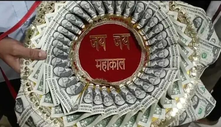 उज्जैन के विश्व प्रसिद्ध श्री महाकालेश्वर मंदिर में देश भर आने वाले भक्त सोना चांदी नगदी दान करते हैं. लेकिन पहली बार किसी भक्त ने बाबा महाकाल को भस्म आरती में अमेरिकन डॉलर से बनाई माला भेंट की. जिसे देख मंदिर प्रशासन भी सकते में रह गया. हालांकि यह पता नहीं चला कि माला में कितने डॉलर लगे हैं.