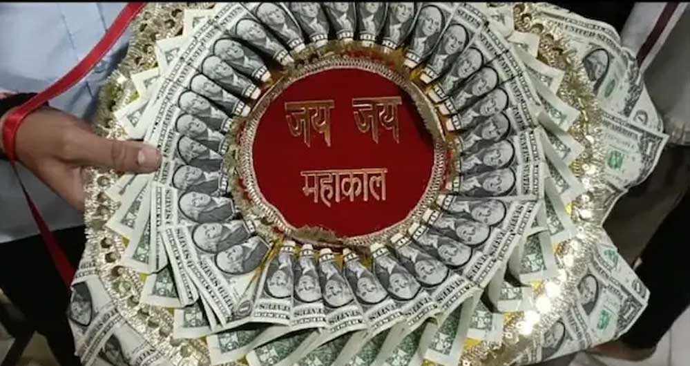 लेकिन शनिवार तड़के भस्म आरती में किसी भक्त ने अमेरिकन डॉलर से बनी तीन फीट की माला भगवान महाकाल को भेंट कर दी. माला में 200 से अधिक अमेरिकन डॉलर लगे हुए हैं. जिसके बीच जय श्री महाकाल लिखा हुआ है.