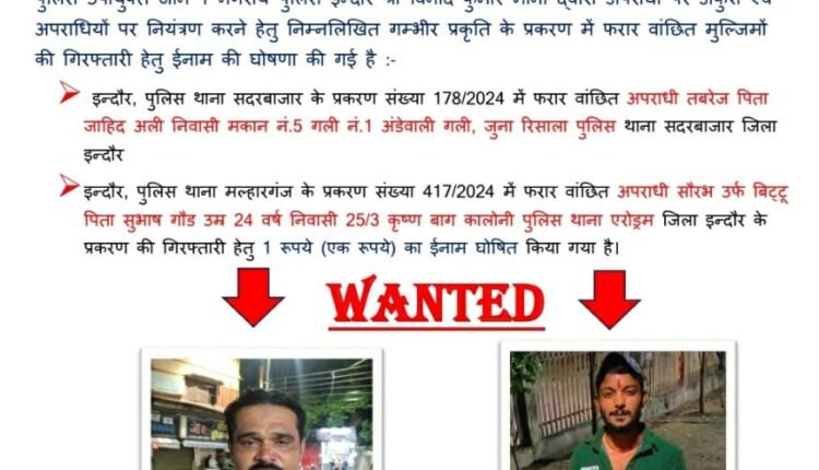 इंदौर। किसी राज्य या जिले में कोई अपराध होता है, तो पुलिस मामला दर्ज कर उन आरोपियों को पकड़ती है और सजा दिलाती है ऐसे में कोई बड़ा अपराधी हो, जिसने बड़े जुर्म किए हों और वह पकड़ा न जा रहा हो तो पुलिस उसे पकड़ने के लिए अलग-अलग राशि के इनाम की भी घोषणा करती है। जिससे अपराधी को पकड़ने में थोड़ी-बहुत आसानी हो कुछ इसी तरह इंदौर पुलिस ने दो आरोपियों पर इनाम की घोषणा की है खास बात यह है कि पुलिस कोई हजार-लाख रुपए नहीं बल्कि महज 1 रुपए के इनाम की घोषणा दो आरोपियों पर की है।