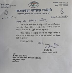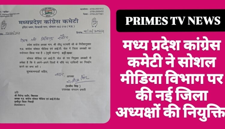 Breaking News : मध्य प्रदेश कांग्रेस कमेटी ने सोशल मीडिया विभाग पर की नई जिला अध्यक्षों की नियुक्ति