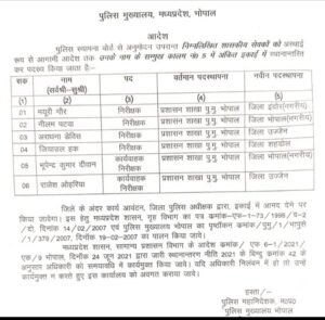 भोपाल। पुलिस मुख्यालय ने आज आधा दर्जन पुलिस निरीक्षकों की नई पदस्थापना के आदेश जारी किए हैं।