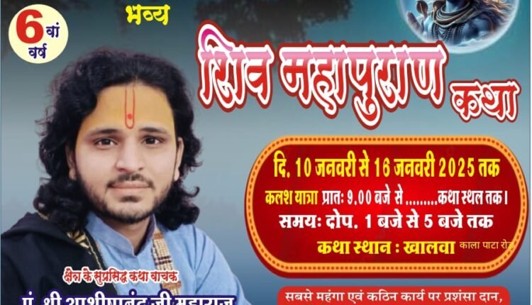 नगर के नर्मदा मंदिर से कलश यात्रा प्रारंभ हुई। इस कलश यात्रा ने नगर के मुख्य मार्गो से होते हुए कालापाठा रोड हरिशंकर साध व रविशंकर साध जी मुख्य यजमान के खेत कथा स्थल तक अपना सफर तय किया। इस दौरान नगर में भक्तो की भारी भीड उमड पडी थी। कलश यात्रा मार्ग पर भक्तो द्वारा पुष्प वर्षा की गई। नगर की माताओं और वहनो द्वारा अपने सिर पर कलश लेकर भारी संख्या मे यात्रा में शामिल हुई। इस दौरान नगर वासियो द्वारा कलश यात्रा, शिव महापुराण पोथी व कथावाचक पंडित श्री आशीषानंद जी महाराज जी का पुष्प वर्षा कर स्वागत हुआ। शिव महापुराण कथा का वाचन क्षेत्र के सुप्रसिद्ध कथा वाचक श्री आशीषानंद जी महाराज धारूखेडी वाले के मुखारविंद से किया जायेगा। कथा का आयोजन दिनांक 10 जनवरी से 16 जनवरी 2025 तक किया जा रह है। कथा समय सुबह 9.00 बजे से दोपहर 1 बजे तक का है। शिव महापुराण कथा का आयोजन साध परिवार द्वारा पिछले वर्ष अनुसार इस वर्ष भी किया जा रह है और कथा के मुख्य यजमान हरिशंकर साध द्वारा क्षेत्र वासियो से अपील की गई की अधिक से अधिक संख्या में पधार कर शिव महापुराण कथा का श्रवण कर पुण्य कर्म का फल प्राप्त करे।