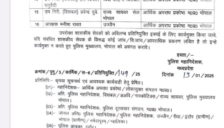 भोपाल। मध्य प्रदेश पुलिस मुख्यालय के द्वारा देर रात 16 पुलिस कर्मियों के पदस्थापन ना करते हुए एक स्थान से दूसरे स्थान पर स्थापना की गई जिसमें देव जबलपुर सतना इंदौर धार विदिशा ग्वालियर रीवा सीधी गोपाल उज्जैन सहित कई जिलों के अधिकारी कर्मचारी को आर्थिक अपराध प्रकोष्ठ मध्य प्रदेश भोपाल में नवीन पद स्थापना की गई है ।