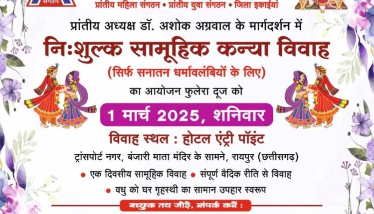 छत्तीसगढ़ प्रांतीय अग्रवाल संगठन द्वारा एक दिवसीय निशुल्क सामूहिक कन्या विवाह का आयोजन 1 मार्च को रायपुर के होटल एंट्री प्वाइंट में किया जा रहा है जिसकी जानकारी हमें छत्तीसगढ़ प्रांतीय अग्रवाल संगठन शिवरीनारायण जिला इकाई की अध्यक्ष गूंजा सुल्तानिया ने दी है और उन्होंने सनातन धर्म के धर्मावलंबियों को इस कन्या विवाह में आमंत्रित किया है और प्रांतीय अध्यक्ष अशोक अग्रवाल के मार्गदर्शन में सामूहिक कन्या विवाह का आयोजन किया जा रहा है जिसमें पूरे छत्तीसगढ़ प्रदेश के हिन्दू धर्म के जितने भी जोड़े है कन्याओं का विवाह निःशुल्क रूप से किया जा रहा है। निःशुल्क रजिस्ट्रेशन के लिए संपर्क करे,, श्रीमती शोभा केडिया