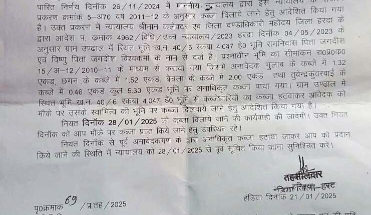 मध्य प्रदेश मे ही नही बल्कि समूचे भारत मे राजस्व संबंधित जमीन – जायदाद या प्रॉपर्टी वाले मामले पूर्णतया लंबित चलते रहते हैं। लेकिन मामला अगर न्यायालय तक पहुंच जाए और न्यायालय संबंधित अधिकारी को आदेश कर दें तो पूर्ण रूप से यह माना जाता है कि उसका निराकरण सभवतः हो गया है । लेकिन मध्य प्रदेश के हरदा जिले का एक ऐसा ही मामला प्रकाश में आया है। जहां पर जबलपुर उच्च न्यायालय ने प्रशासनिक अधिकारियों को 10 एकड़ पर फरियादी को कब्जा दिलाने की बात कही है, परंतु उक्त मामले मे देरी हो रही है । हरदा जिले के तहत तहसील हंडिया मे ग्राम उन्ढाल के किसान रामनिवास पिता जगदीश विश्वकर्मा के द्वारा उच्च न्यायालय जबलपुर मे रिट पिटीशन दायर की थी । कोर्ट ने रामनिवास को कब्जा दिलाने के लिए संबंधितों को आदेश किया था , जिसकी तारीख 28 जनवरी थी। लेकिन अभी तक वहाँ कोई प्रशासनिक अधिकारी नही पहुँचा । उस जमीन पर तीन लोगों का कब्जा बताया जा रहा है । जानकारी के मुताबिक आवेदक पूर्व मंत्री का गरीबी बताया जा रहा है।