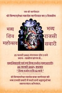 *इतीहास के पन्नो.से.भगवान राम के वंशज राजा रांति देव द्वारा यज्ञ में उत्पन्न स्वयंभूबाबा बिल्वामृतेश्वर महादेव जी कें रेवा गर्भ बेट संस्थान , महर्षि दधीचि की तपोभूमि,मां रेवा का गर्भ स्थल धर्मराज युधिष्ठिर जी के नाम पर बसाई गई नगरी धर्मपुरी,रानी रूपमती से जुड़े तथ्य एवं पांच पांडवों का अज्ञात वास की नगरी जागीरदार नगरी में आप जैसे देव तुल्य श्रद्धालुओं का महाशिवरात्रि के तीन दिवसीय पर्व पर हृदय से अभिनंदन है।दिनांक 25फरवरी को तहसील प्रांगण से प्रारंभ भगवान जागीरदार की शाही सवारी जिसमे सभी प्रांतों से आए नृत्य दल,ढोल नगाड़ों, बैंड बाजे,डीजे, के साथ निकलने वाली शाही सवारी की तैयारी पूर्ण सभी धर्मप्रेमी जनता अधिक से अधिक संख्या में पधार कर इस ऐतिहासिक सवारी को सफल बनावे ।