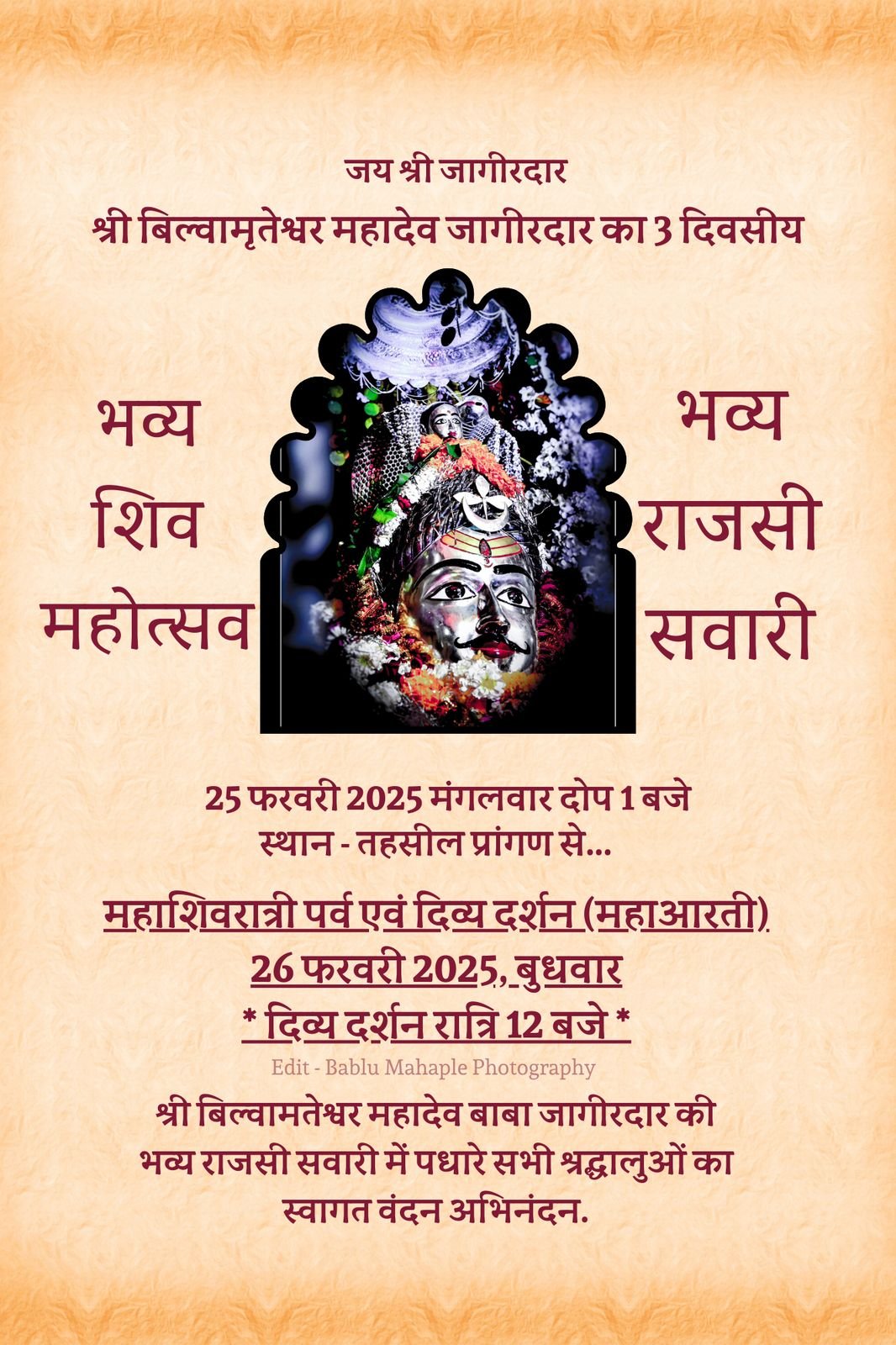 *इतीहास के पन्नो.से.भगवान राम के वंशज राजा रांति देव द्वारा यज्ञ में उत्पन्न स्वयंभूबाबा बिल्वामृतेश्वर महादेव जी कें रेवा गर्भ बेट संस्थान , महर्षि दधीचि की तपोभूमि,मां रेवा का गर्भ स्थल धर्मराज युधिष्ठिर जी के नाम पर बसाई गई नगरी धर्मपुरी,रानी रूपमती से जुड़े तथ्य एवं पांच पांडवों का अज्ञात वास की नगरी जागीरदार नगरी में आप जैसे देव तुल्य श्रद्धालुओं का महाशिवरात्रि के तीन दिवसीय पर्व पर हृदय से अभिनंदन है।दिनांक 25फरवरी को तहसील प्रांगण से प्रारंभ भगवान जागीरदार की शाही सवारी जिसमे सभी प्रांतों से आए नृत्य दल,ढोल नगाड़ों, बैंड बाजे,डीजे, के साथ निकलने वाली शाही सवारी की तैयारी पूर्ण सभी धर्मप्रेमी जनता अधिक से अधिक संख्या में पधार कर इस ऐतिहासिक सवारी को सफल बनावे ।