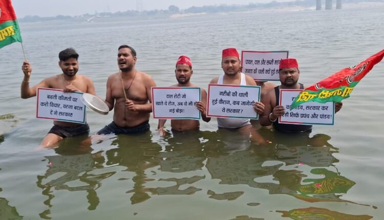 वाराणसी। देश में लगातार बढ़ती महंगाई के खिलाफ समाजवादी बाबा साहेब अंबेडकर वाहिनी के महानगर अध्यक्ष अमन यादव के नेतृत्व में आज वाराणसी में मां गंगा की गोद में अर्धनग्न होकर विरोध प्रदर्शन किया गया। इस दौरान थरिया-घंटा पीटकर प्रधानमंत्री नरेंद्र मोदी, जो स्वयं को “मां गंगा का पुत्र” कहते हैं, को जगाने का प्रयास किया गया। इस विरोध प्रदर्शन के जरिए सरकार की जनविरोधी नीतियों के खिलाफ जनता के आक्रोश को प्रकट किया गया।