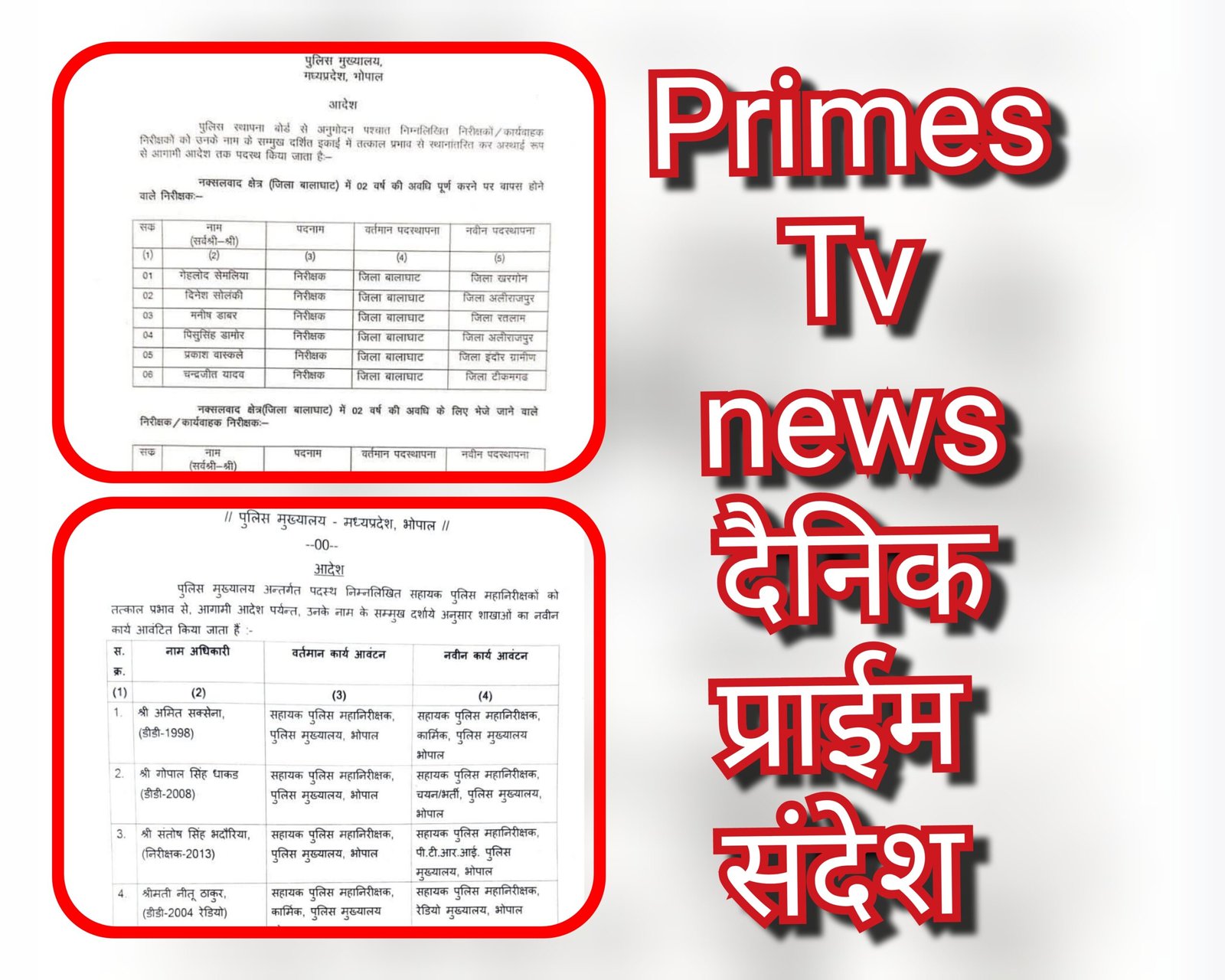 भोपाल । मध्य प्रदेश पुलिस मुख्यालय के द्वारा सहायक पुलिस महानिरीक्षक को के तत्काल प्रभाव से ट्रांसफर करते हुए प्रभार जारी किए गए वहीं पुलिस निरीक्षकों के ट्रांसफर करते हुए अलग-अलग जिलों में नई पोस्टिंग दी गई ।