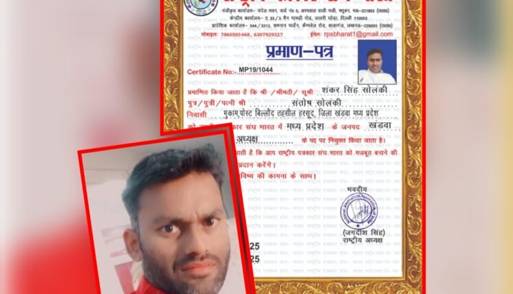 राष्ट्रीय पत्रकार संघ भारत के राष्ट्रीय अध्यक्ष जगदीश सिंह के मार्ग दर्शन पर एवं राष्ट्रीय अध्यक्षा महिला विंग श्रीमती पुनम सिंह के निर्देशाअनुसार व म प्र अध्यक्ष ऋऋषिकेश त्रिपाठी एवं मप्र उपाध्यक्ष. भागवत द्विबेदी एवं म प्र महामंन्त्री. नरेंद्र पांण्ड़े जी एवं जिला अध्यक्ष गोपाल शुक्ला जी हरदा. की सहमति से इनको राष्ट्रीय पत्रकार संघ भारत का हरदा जिला प्रभारी बनाया गया है शंकर सोलंकी जिला अध्यक्ष खंडवा का कहना है की जो हमे संगठन में जो दायित्व सौंपा गया है उसे हम निष्ठा और समान रूप से संगठन मे कार्यकारणी गठित करेंगे। जिसमें संगठन के पदाधिकारी राकेश मिश्रा जिला अध्यक्ष रीवा. बिकास द्विबेदी जिला अध्यक्ष सिंगरौली. रमाकांत दुबे जिला अध्यक्ष जबलपुर उमरिया जिला अध्यक्ष दिवाकर मिश्रा. जिला अध्यक्ष सिंगरौली. प्रीती राय महिला बिंग जिला अध्यक्ष सतना. जितेंद्र अग्निहोत्री जिला अध्यक्ष दतिया. बिकास द्विबेदी जिला अध्यक्ष भोपाल. अरुण पांड़े