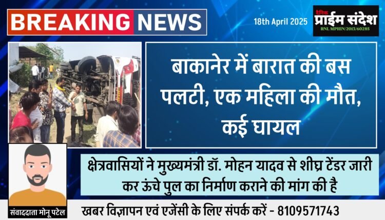 धार जिले की मनावर तहसील के बाकानेर क्षेत्र में आज सुबह एक दर्दनाक हादसा हो गया। नागदा जंक्शन (जिला उज्जैन) से धार जिले के ग्राम कुव्वाली बडदा जा रही बारात की बस (क्रमांक MP13 P1335) सुबह करीब 9 बजे मान नदी के रपटे पर पलट गई। हादसे में दूल्हा राजपाल सिंह की मौसी की मौके पर ही मौत हो गई, जबकि कई बाराती घायल हो गए।