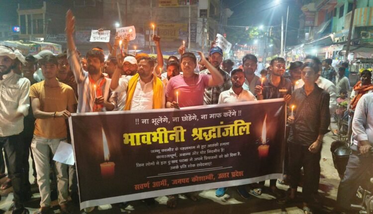 के नारे गूंजते रहे।साथ ही आतंकियों का पुतला फूंका गया। सवर्ण आर्मी के अध्यक्ष ने कहा कि निर्दोष नागरिकों पर यह हमला कायरता की पराकाष्ठा है। उन्होंने ने केंद्र सरकार से आतंकियों पर सख्त कार्यवाही की मांग की। प्रधानमंत्री नरेंद्र मोदी से पाकिस्तान समर्थित आतंकियों के खिलाफ निर्णायक कदम उठाने का अनुरोध किया। कार्यक्रम के अंत में दो मिनट का मौन रखकर शहीदों को श्रद्धांजलि दी गई।देश की सुरक्षा के लिए प्रार्थना के साथ लोगों को शांति बनाए रखने की अपील भी की गई। इस कैंडल मार्च में रहे अनूप मिश्रा, पुरेंद्र द्विवेदी, राना तिवारी,रोहित मिश्रा, कन्हैया मिश्रा,अतुल मिश्रा,अन्नू तिवारी ,गोविंद मिश्रा,मोहित कुशवाहा, दीपक पाण्डेय, मोहित उपाध्याय, अखिलेश मिश्रा, शुभम तिवारी,शिवपूजन मिश्रा,अमित पाण्डेय आदि सैकड़ों सवर्ण आर्मी परिवार मौजूद रहे।