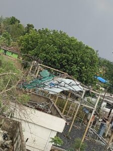 भैयाथान में कहर बनकर टूटा तूफान: तेज आंधी-बारिश से पेड़ गिरे, छतें उड़ीं, जनजीवन अस्त-व्यस्त; स्कूल से लेकर कथा स्थल तक में तबाही