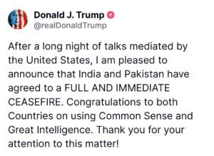 डोनाल्ड ट्रम्प ने कहा, ‘रात यूएसए की मध्यस्थता में चली लंबी बातचीत के बाद मुझे बताते हुए खुशी हो रही है कि भारत और पाकिस्तान तुरंत और पूरी तरह युद्ध विराम के लिए तैयार हो गए हैं। मैं दोनों देशों को कॉमनसेंस, समझदारी से भरा फैसला लेने के लिए बधाई देता हूं।’