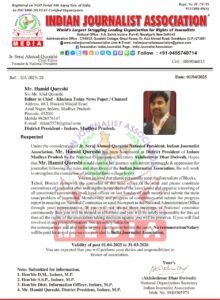 हमीद कुरैशी को इंडियन जर्नलिस्ट एसोसिएशन का जिला इंदौरअध्यक्ष बनाया गया।