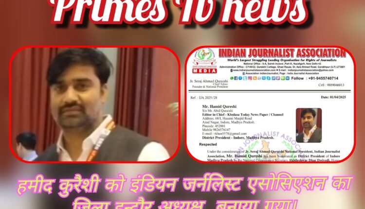 हमीद कुरैशी को इंडियन जर्नलिस्ट एसोसिएशन का जिला इंदौरअध्यक्ष बनाया गया।