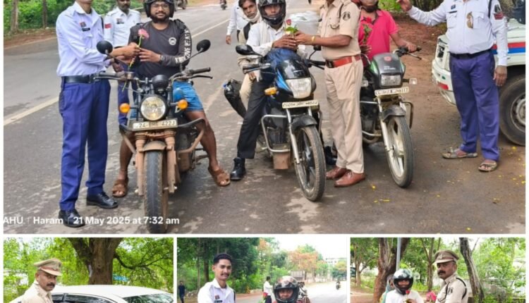 सड़क सुरक्षा नियमों से परिपूर्ण वाहनों को रोक कर यातायात प्रभारी ने गुलाब से किया स्वागत