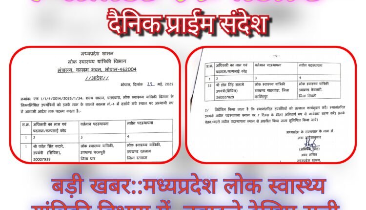 बड़ी खबर: मध्यप्रदेश लोक स्वास्थ्य यांत्रिकी विभाग में तबादले