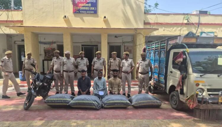 भवानीमण्ड़ी पुलिस के द्वारा नशे के अवैध कारोबार के खिलाफ की जा रही लगातार कार्यवाही में विगत शुक्रवार की रात्री में की गई बड़ी कार्यवाही के दौरान तीन आरोपियों से 89 किलो 300 ग्राम ड़ोड़ाचूरा बरामद करनें में बड़ी सफलता मिली है। जानकारी के अनुसार विगत रात्रि में जुल्मी पिपलिया तिराहा पर पुलिस दल के द्वारा की गई नाकाबंदी मध्य प्रदेश से आ रहे पिकअप वाहप को रोककर तलाशी के दौरान उसे रखे गये खाली कट्टों को हटाकर देखनें पर उसके छुपाकर रखे गये ड़ोड़ाचूरा के कट्टे मिले जिसे जब्त कर प्रयुक्त पिकअप वाहना को भी जब्त किया गया वहीं तीनों आरोपियों को गिरफ्तार कर पूछने पर उनके द्वारा कुशाल सिंह निवासी 28 साल मिश्रोली अरनिया,लालसिंह 21 साल तथा गोपाल लुहार 25 साल मध्य प्रदेश के भानपुरा बाबुल्दा ग्राम का होनें की जानकारी दी गई। गिरफ्तार आरोपियों से ड़ोड़ाचूरा लानें के स्थान आदि की जानकारी पुलिस द्वारा ली जा रही है। पुलिस द्वारा जानकारी में बताया गया कि नशे के अवैध व्यापार के खिलाफ आगे भी लगातार कार्यवाही जारी रहेगी।
