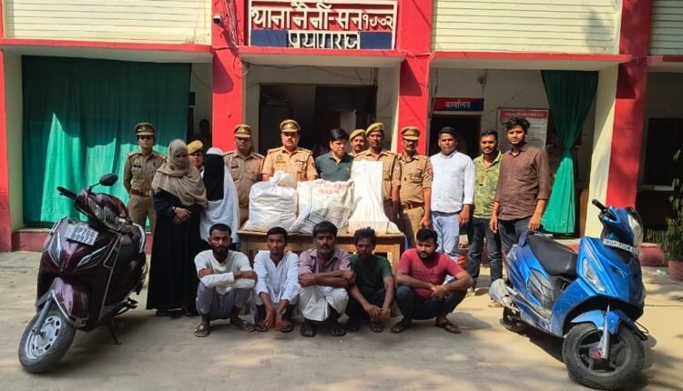 थाना नैनी व एसओजी यमुनानगर जोन की संयुक्त पुलिस टीम द्वारा मुखबिर की सूचना पर आज दिनांक-06.06.2025 को अभियुक्तगण 1. मो0 आशिफ पुत्र मो0 आदिल निवासी पूराफतेह मोहम्मद थाना नैनी कमि0 प्रयागराज 2. मो0 समीर पुत्र मो0 नईम निवासी ग्राम कोनार थाना फूलपुर प्रयागराज 3. मो0 सालिम पुत्र मो0 फाजिल निवासी 58 पुरा फतेहमोहम्मद थाना नैनी प्रयागराज 4. यासीफ उर्फ हसीब पुत्र सगीर निवासी 59 पुराफतेह मोहम्मद थाना नैनी प्रयागराज 5. मो0 आदिल पुत्र मो0 सादिक निवासी 10/4ए पुराफतेह मोहम्मद थाना नैनी प्रयागराज 6. शबीहा उर्फ शमीमा पत्नी मो0 इब्राहिम 7. अरसला पुत्री मो0 इब्राहिम निवासीगण पुराफतेह मोहम्मद थाना नैनी प्रयागराज को पुरा फतेह मोहम्मद मे पेट्रोल पंप से पहले सुफियान के घर थाना क्षेत्र नैनी से गिरफ्तार किया गया । अभियुक्तगण उपरोक्त के कब्जे से मांस, 15 राशि पड़वा व 11 राशि गोवंश (छोटे बड़े) तथा घटना में प्रयुक्त 01 लोडर व 02 स्कूटी व अन्य उपकरण (लकड़ी का ठीहा, 04 चापड़ लोहे का, 13 चाकू छोटा बड़ा, 01 लोहे की कुल्हाड़ी लोहे की बेत लगी, 01 लोहे की सुम्मी, 23 रस्सी (पगहा) एवं 01 इलेक्ट्रानिक कांटा) बरामद किया गया । उक्त गिरफ्तारी/बरामदगी के आधार पर थाना स्थानीय पर मु0अ0सं0-267/25 धारा-3/5A/8 उ.प्र.गोवध निवारण अधिनियम तथा 11 पशु क्रूरता अधिनियम पंजीकृत किया गया । नियमानुसार अग्रिम विधिक कार्यवाही की जा रही है ।